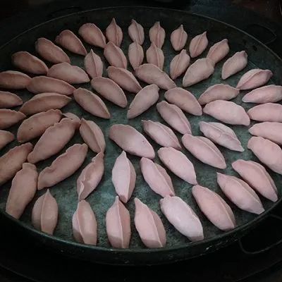 重點說說我愛吃的芋頭餃吧,把它含在嘴里時滑溜溜的,如同泥鰍。選用粉粉軟糯、有粘性的芋頭,和番薯粉一起揉成面團(tuán),然后再包肉餡。煮好的芋餃吃起來既糯又柔,滑溜可口。