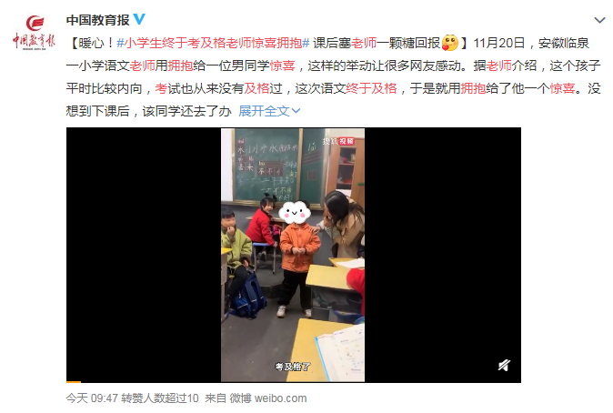 近日,安徽臨泉一小學(xué)語(yǔ)文老師用擁抱給一位男同學(xué)驚喜,這樣的舉動(dòng)讓很多網(wǎng)友感動(dòng)。